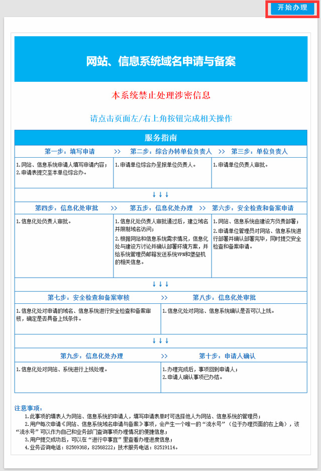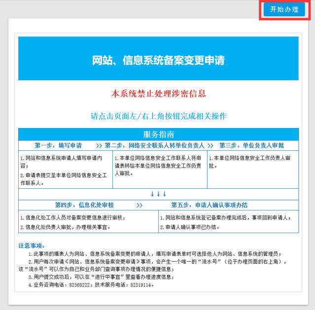 3.请您认真阅读服务指南及页面下方的注意事项后,点击“开始办理”,即可办理相应业务。
