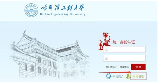 1.进入统一身份认证页面(网址为:http://one.hrbeu.edu.cn),点击页面右下角的账号说明,了解登录账号密码信息。