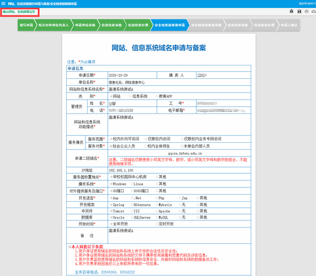 5.经申请单位及信息化处审批后,信息化处与申请单位确认网站、信息系相关情况。申请单位完成网站、信息系统部署后,申请人点击页面左上角选择“确认网站、系统部署完毕”提交后,信息化处对网站、信息系统进行安全检查和备案审核。
