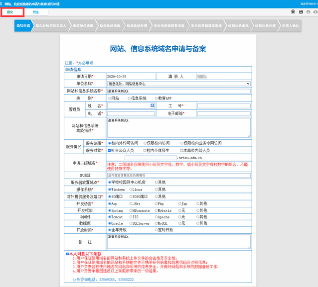 4.进入申请页面,请您按要求填写相关信息内容,认真阅读承诺要求。填写申请信息完成后,在页面左上角选择“提交”。