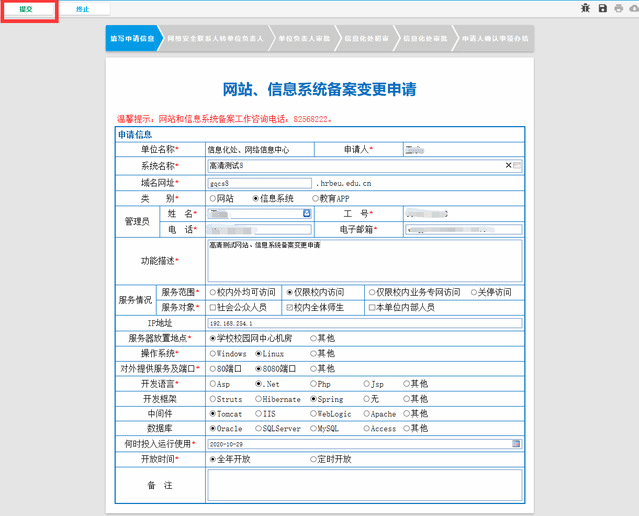 4.进入变更申请页面,请您按要求填写变更信息内容。上述操作完成后,在页面左上角选择“提交”。